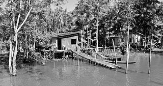 Inutile de dire la longue navigation entre les rives vertes. Maison sur pilotis au bord du fleuve.